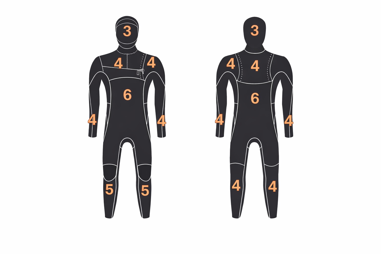 6mm panels are positioned through the core and upper torso, where heat retention is critical in cold water.